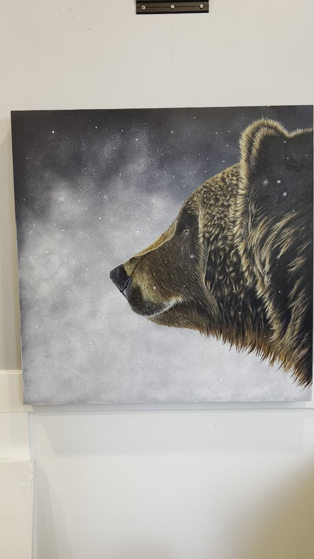 I LOVED painting the falling snow. That was something new for me- to be able to paint depth into the falling snow with some flakes out of focus. His fur, as with every bear I’ve painted, was the most challenging- even after painting him twice before. I’ve been working hard on figuring out my layering process with glazes and so many different kinds of layers. I learned so much and figured out a lot of strategy and colour-mixes that create the depth of fur I’m looking for. I hope you like him!
