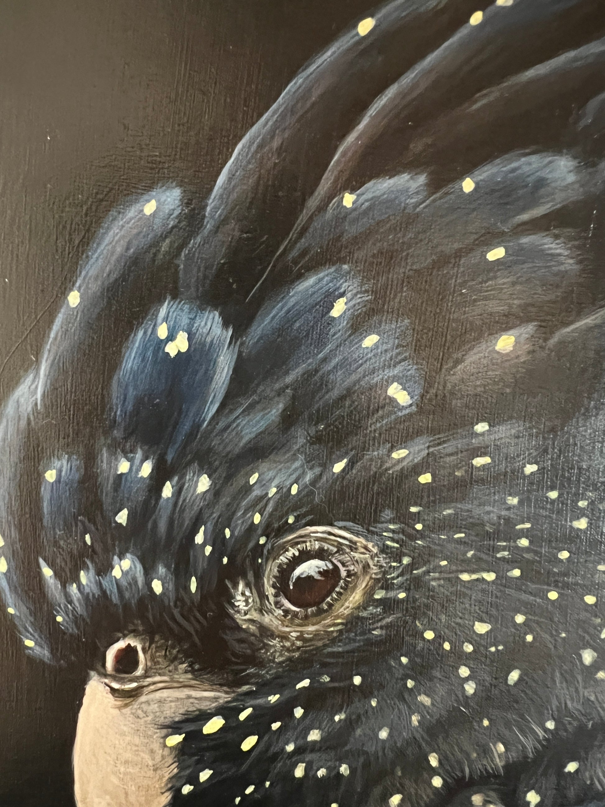 A fun little painting of a black cockatoo! It’s acrylic on panel, framed, and measures 10x10”