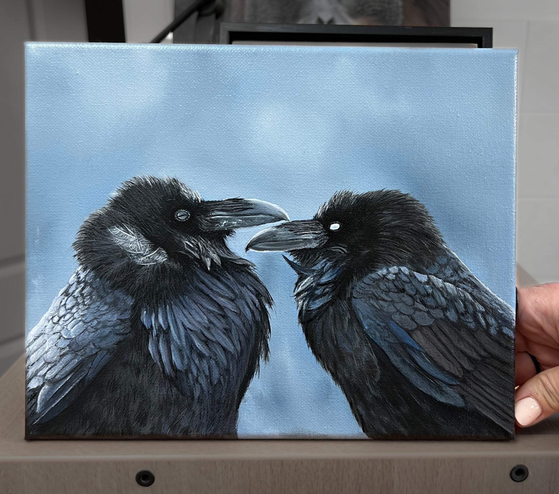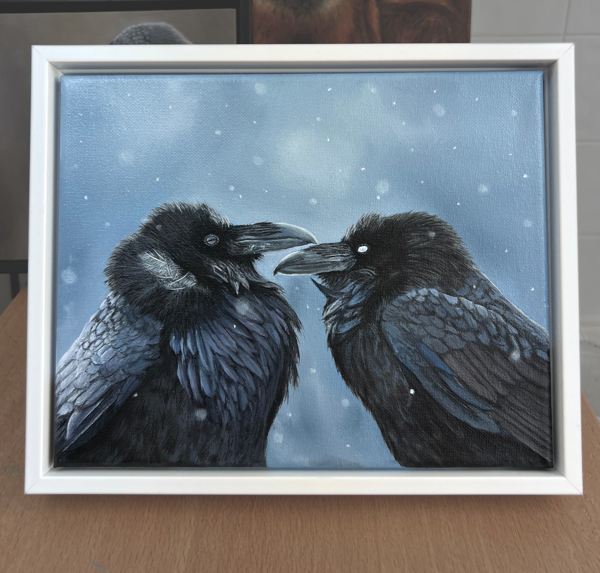 This painting is the second of two paintings in my mini “Crows” painting collection. These two crows are huddled together as one sleeps and the other takes the ‘first watch’ with the slightest touch of one beak on the other. I love the implied tenderness and care of the birds for each other as communicated in their postures toward each other.