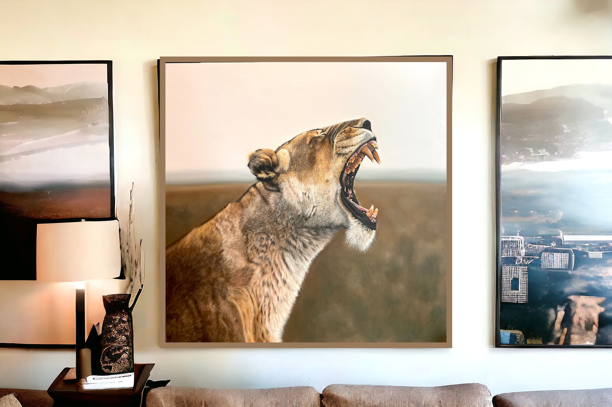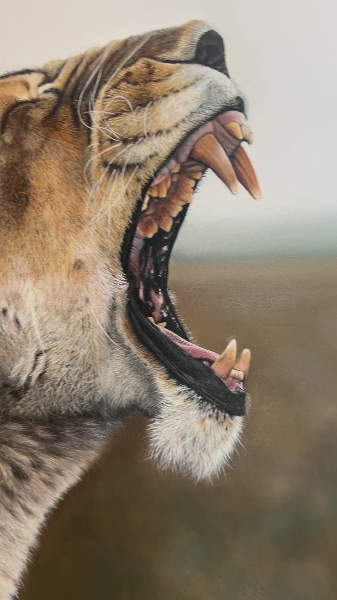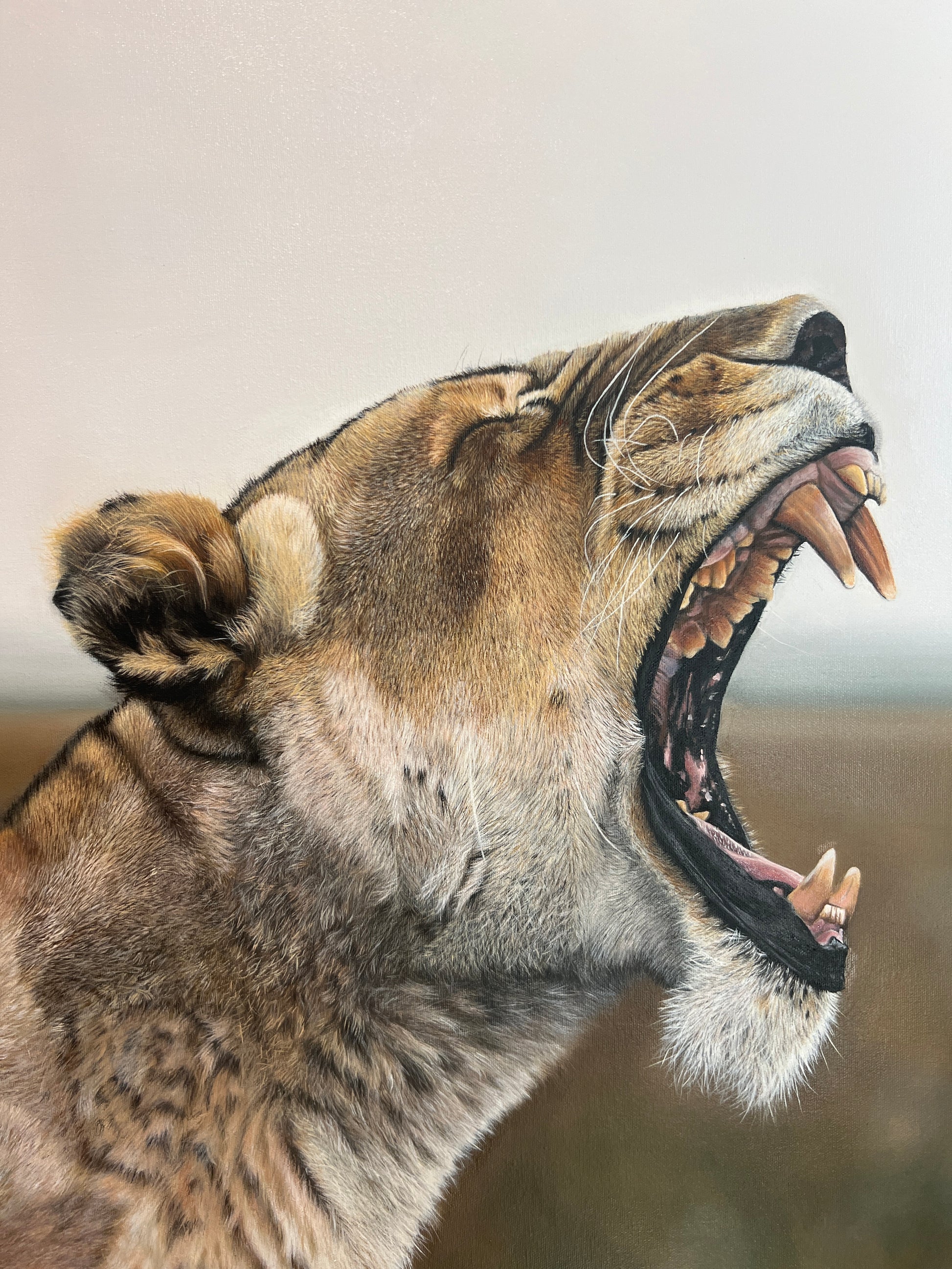 A lioness captured mid-roar both powerful and primal. This hyperrealistic painting highlights the intricate textures of her fur, and the raw intensity of her expression. My goal in painting this so real and life-size is for the viewer to hear her roaring as loudly as her body communicates visually. The muted background contrasts with her strength. It speaks strongly to the empowerment of women everywhere.