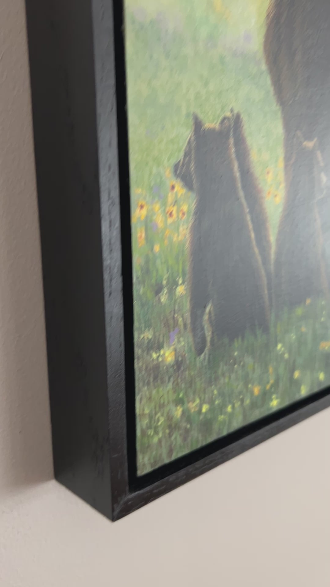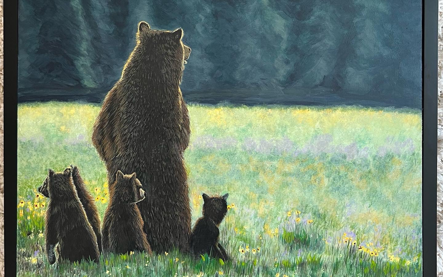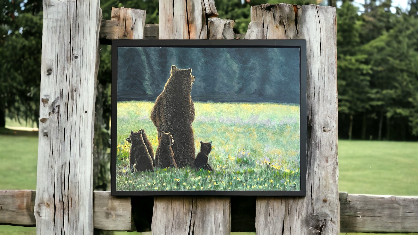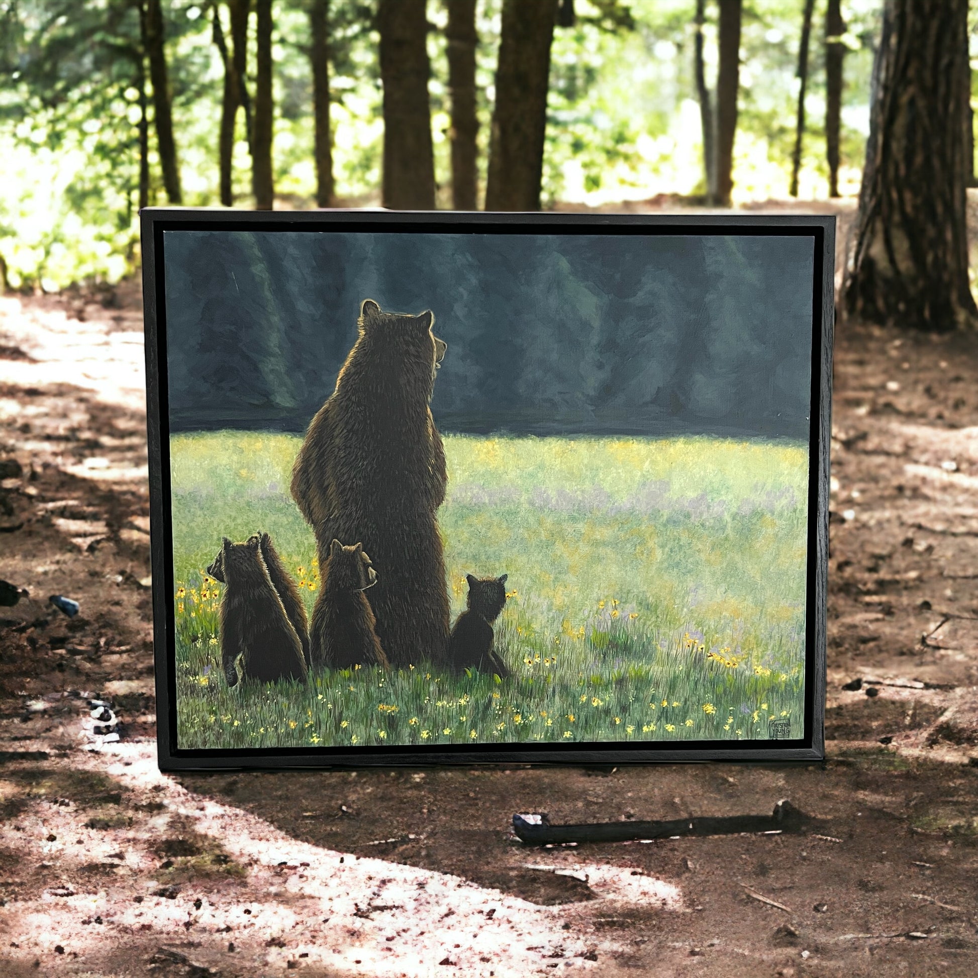 A Momma bear and her 3 cubs ‘On the Lookout’ in a field of wildflowers in the Canadian Rockies.