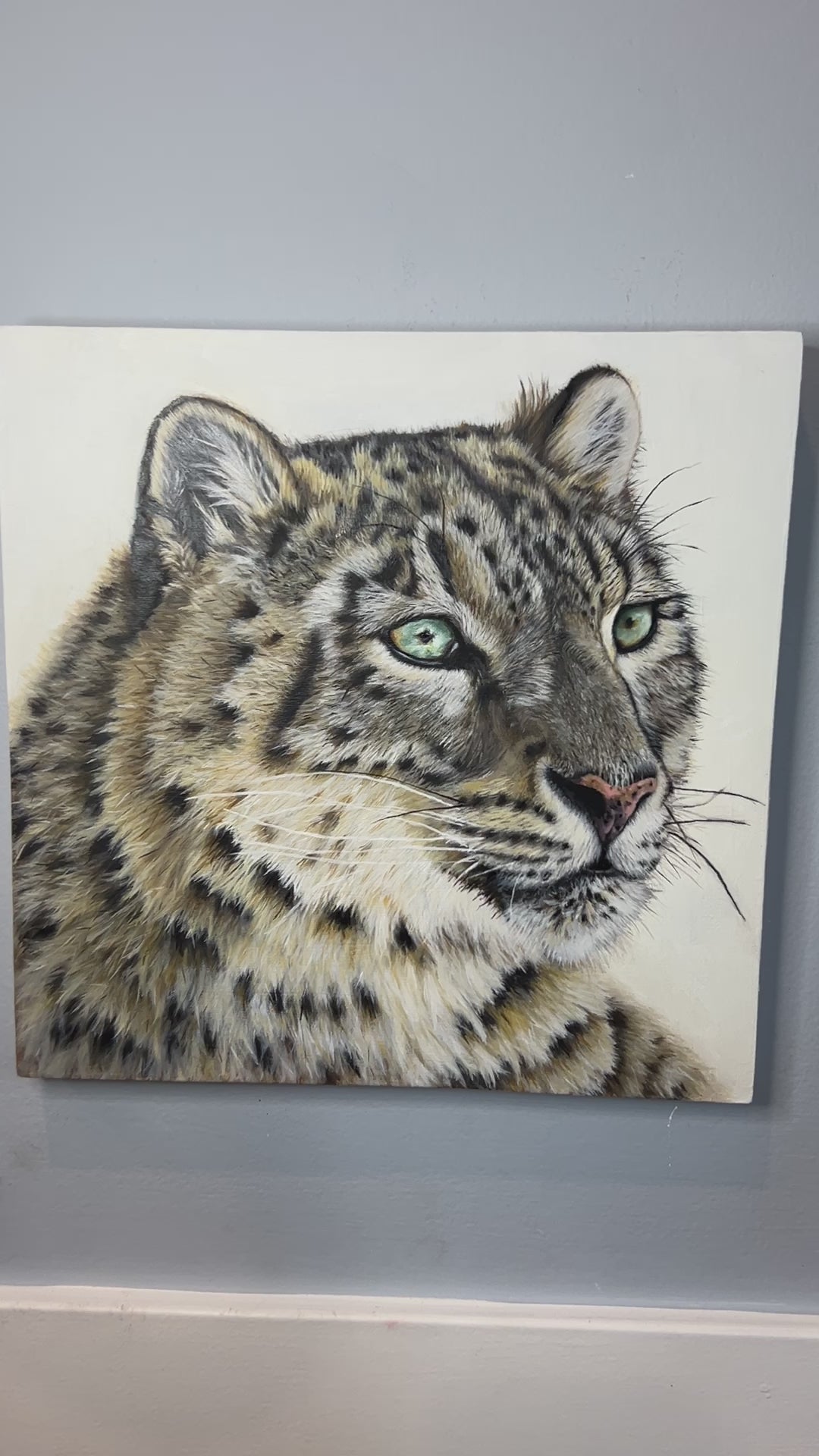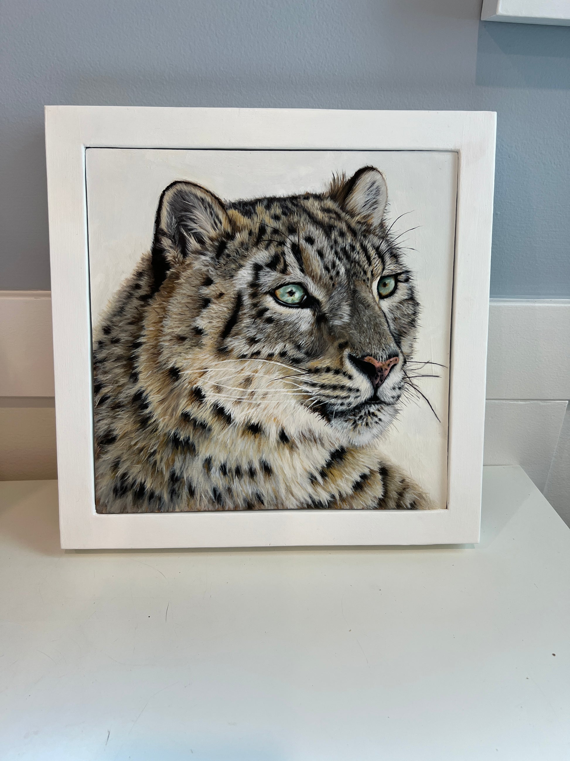 This snow leopard painting is 10x10” on board, painted in acrylic and oil and is framed and ready to hang!