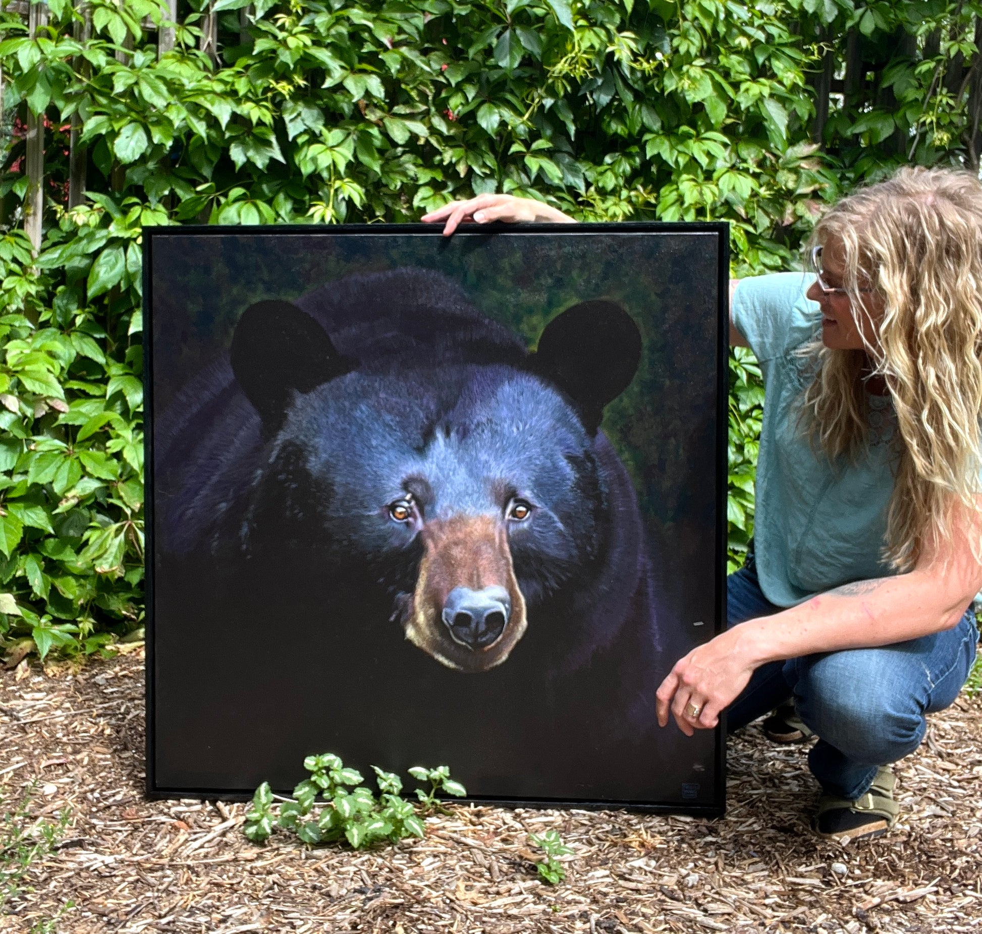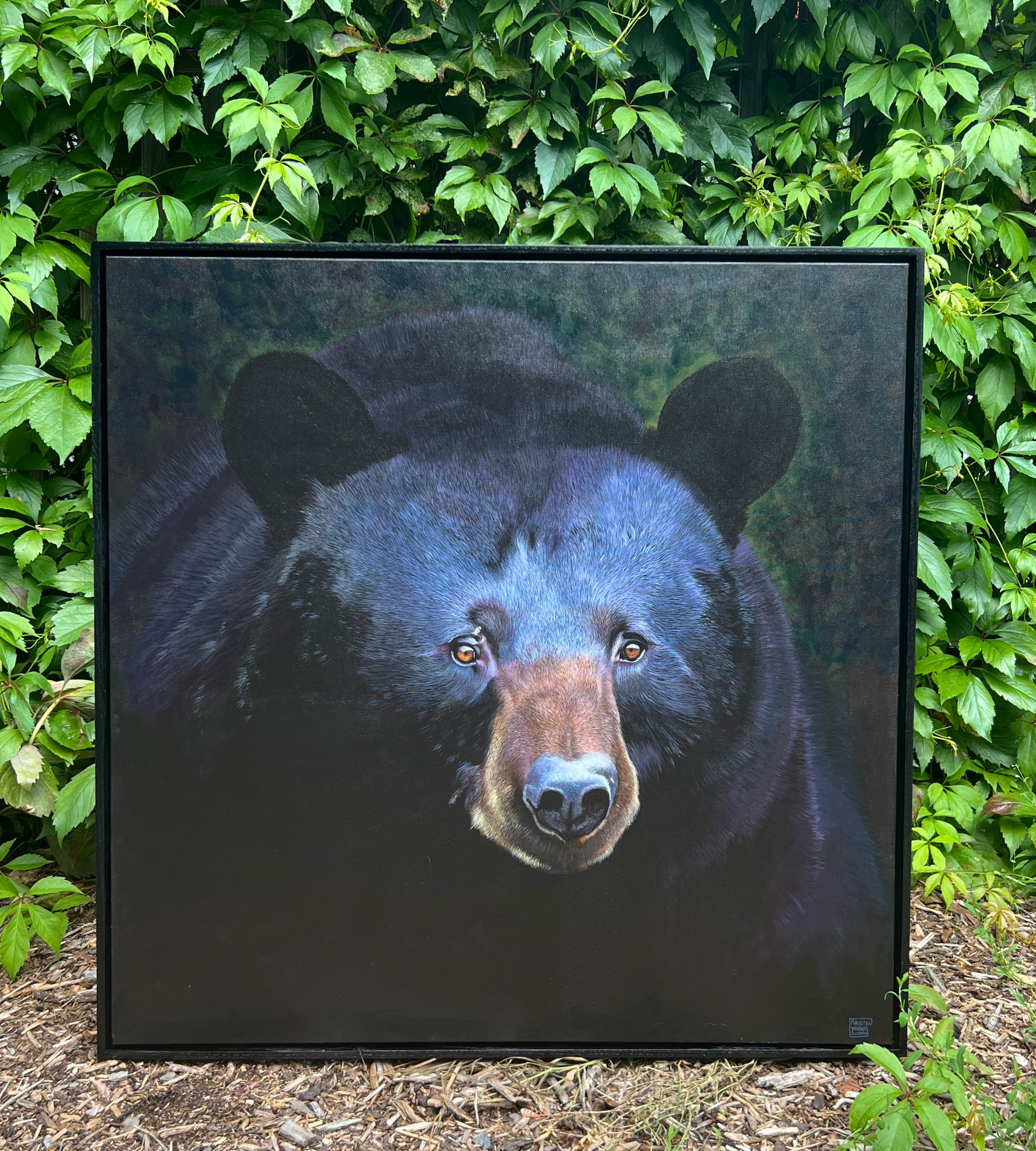 36”x 36” Black Bear acrylic painting, framed in a black floating frame made by Rustic Burl & Co.